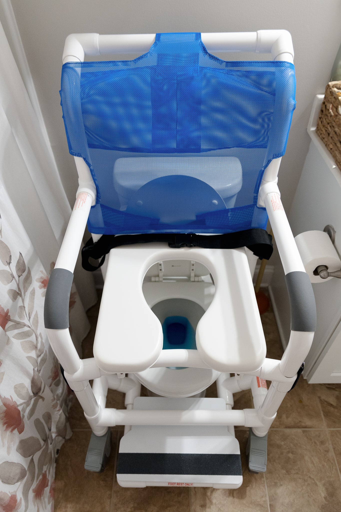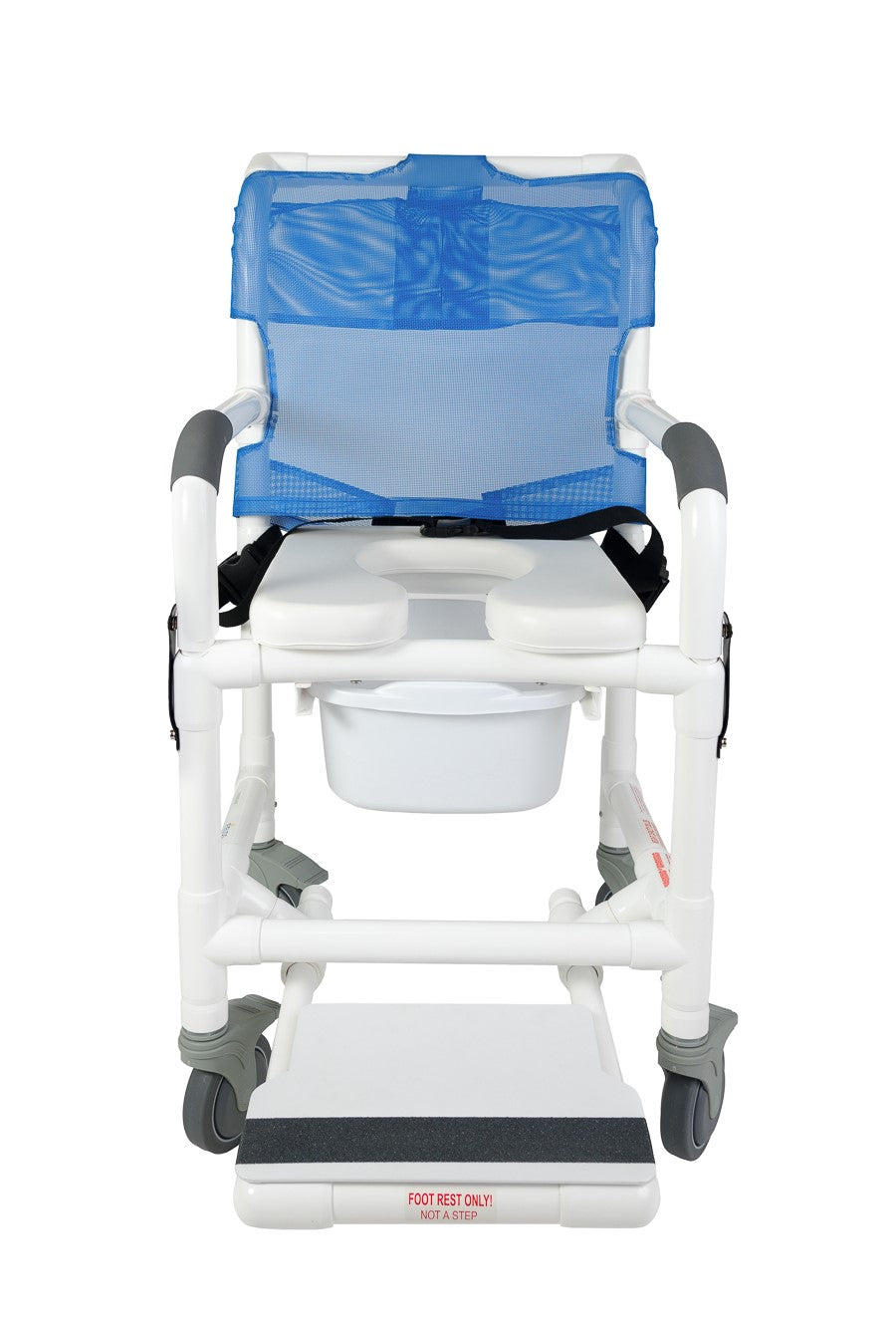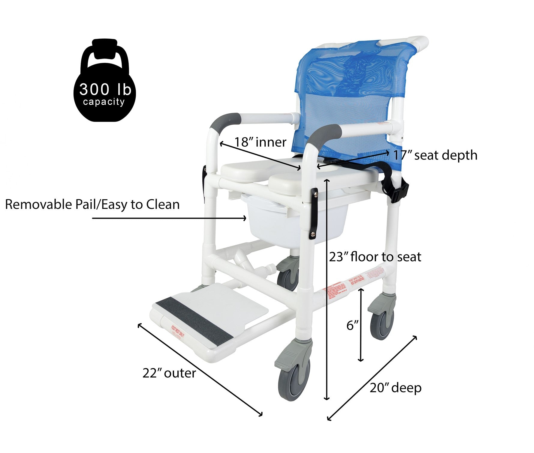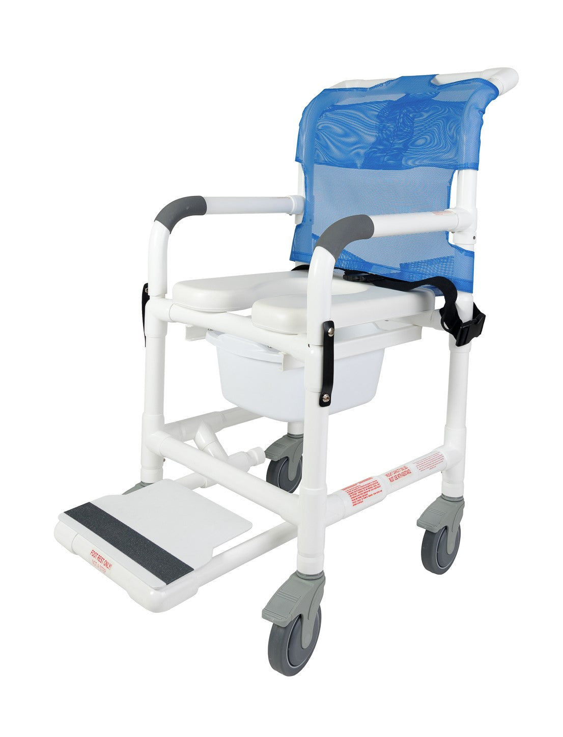 - Soft Padded Seat, Seatbelt and Removable Commode Pail. Medical Grade PVC with a Mesh Seatback.
