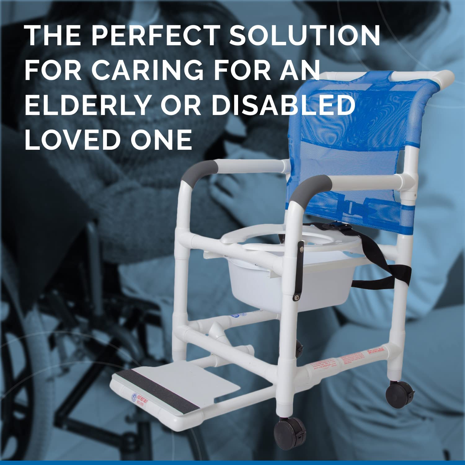 - Features Drop Arms, Antimicrobial Mesh Seat, Locking Casters, Seat Belt, Slide Out Footrest and Commode Pail. 300 lb. Capacity, Fits Over Standard Toilet.