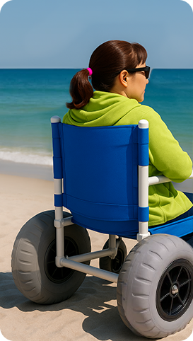Navigate sand with ease using our beach wheelchairs—built with large balloon tires for smooth mobility on soft sand. Designed with a rust-free frame and tool-free assembly, each chair is lightweight, easy to transport, and built for outdoor comfort and reliability.